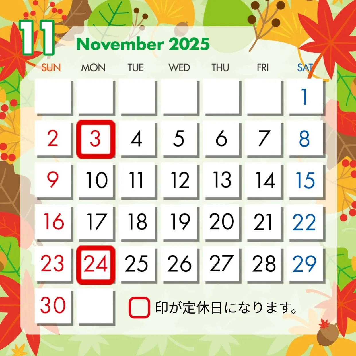 【定休日のお知らせ】 2025/10/31 【定休日のお知らせ】 11月の定休日は 3日(月)・24日(月)になります! お問い合わせ・点検整備は翌営業日からの対応となります🚗 ご迷惑お掛けしますが、よろしくお願い致します✨🙏